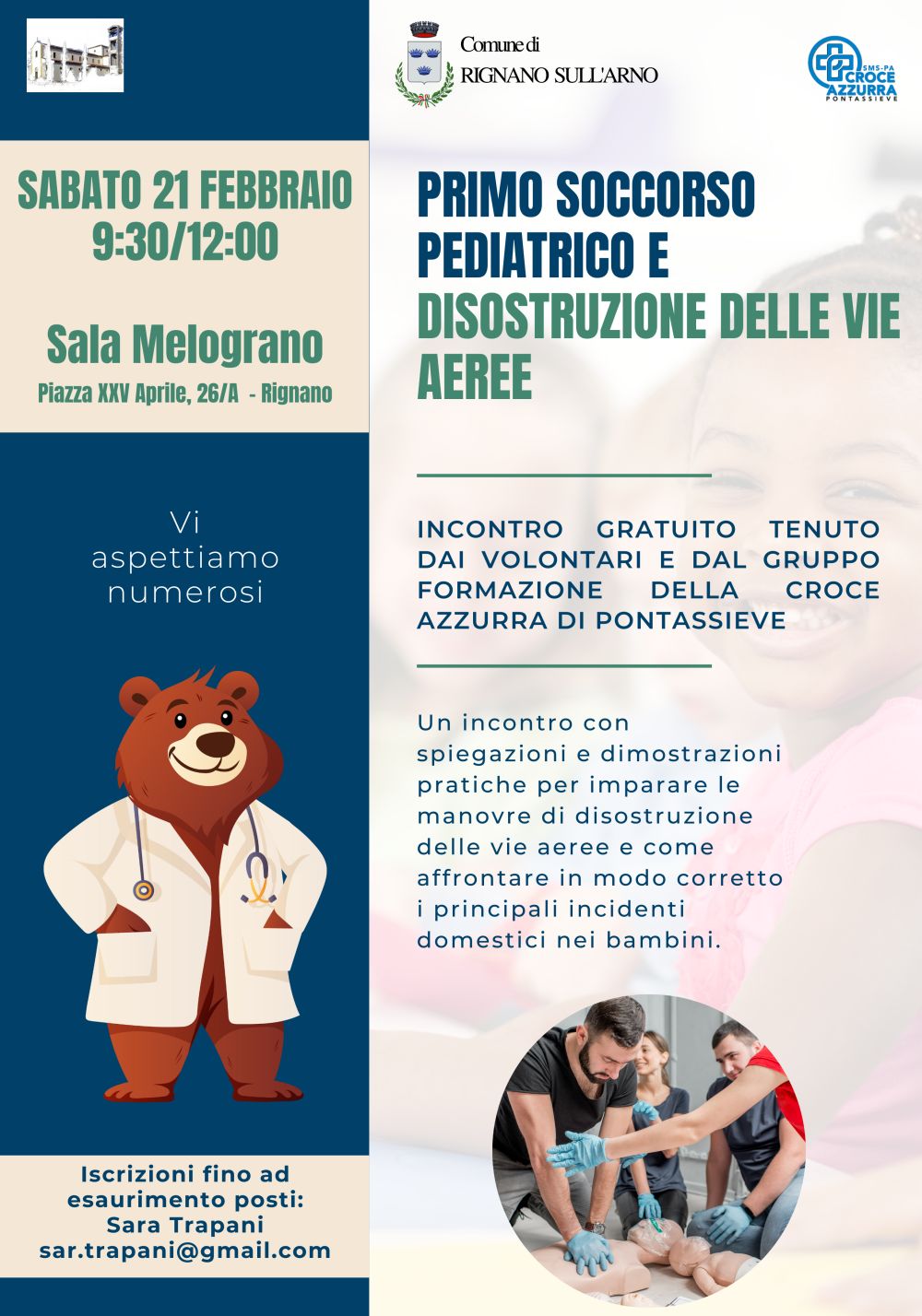 Il Comune di Rignano sull’Arno, in collaborazione con la Croce Azzurra di Pontassieve, organizza un incontro gratuito dedicato al primo soccorso pediatrico e alla disostruzione delle vie aeree in caso di soffocamento.