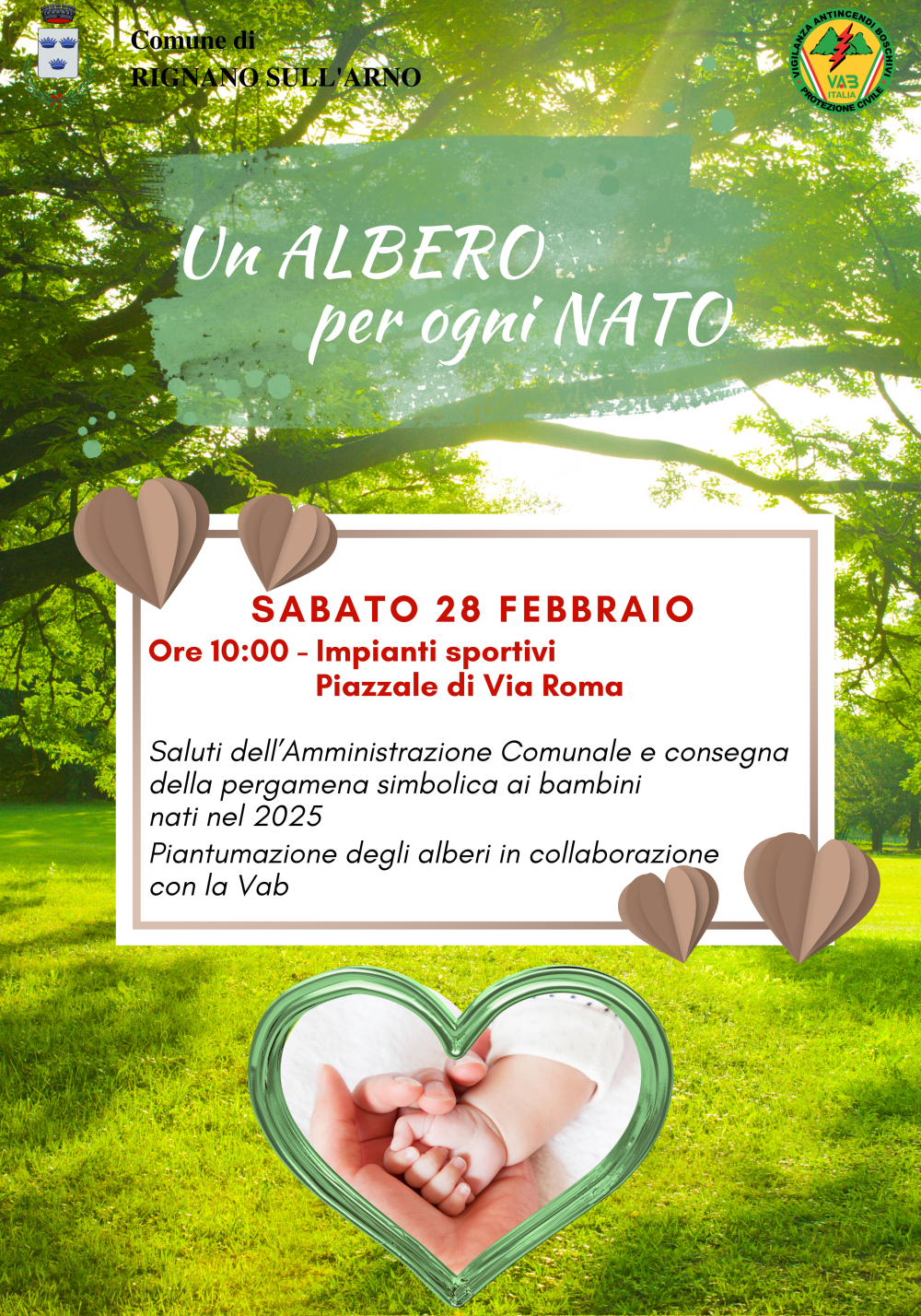L’Amministrazione Comunale di Rignano sull’Arno è lieta di invitare la cittadinanza all’iniziativa “Un albero per ogni nato”, in programma sabato 28 febbraio 2026 alle ore 10.00 presso gli Impianti Sportivi - Piazzale di Via Roma.